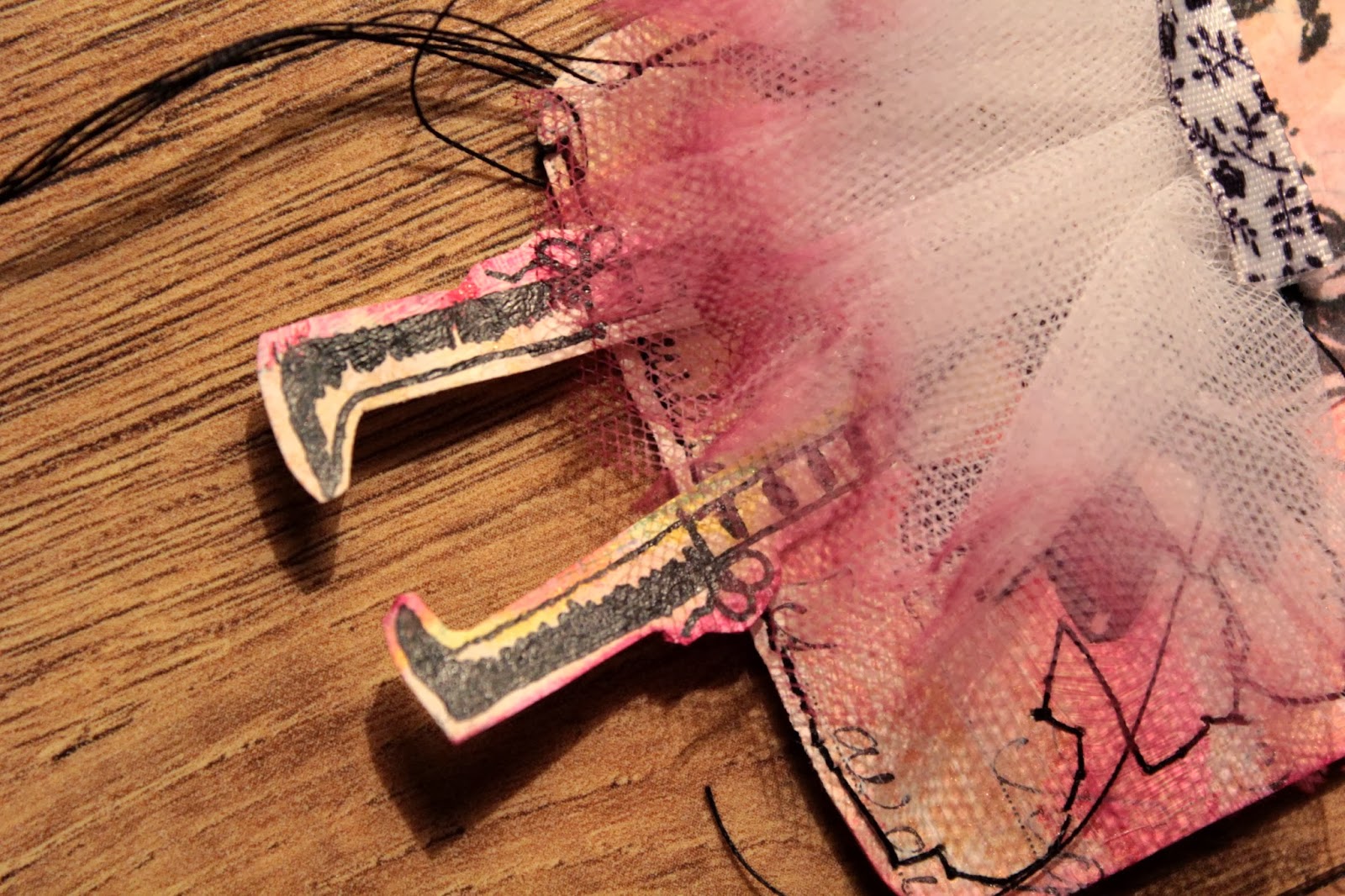 Le tutu est réalisé tout en récup, dans un tulle d'aumônière à dragées. Je l'ai distressé en rose! puis cousu.