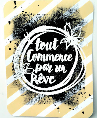 J'ai déposé au centre des cartes fond jaune du gesso noir appliqué au couteau. Laisser sécher. Puis tamponner au centre avec de l'encre Versamark, puis embosser à chaud avec la poudre jasmine de Aladine.